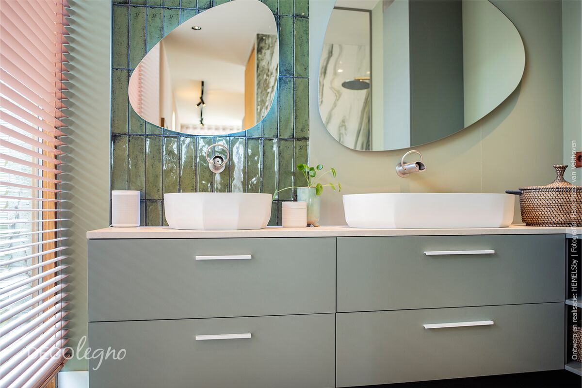Ook in badkamerdesign wordt de kleurtrend duidelijk zichtbaar. Kleur is van directe invloed op onze stemming. De keuze voor de kleur groen in dit ontwerp maakt dat we de dag fris kunnen beginnen, maar evengoed rustgevend kunnen afsluiten. Het badkamermeubel is uitgevoerd in de UB25 Ovatta. Een tijdloze cementgrijs met een vleugje groen. De in facet afgeronde waskommen en ovale spiegels zorgen voor een eigentijdse sfeer.