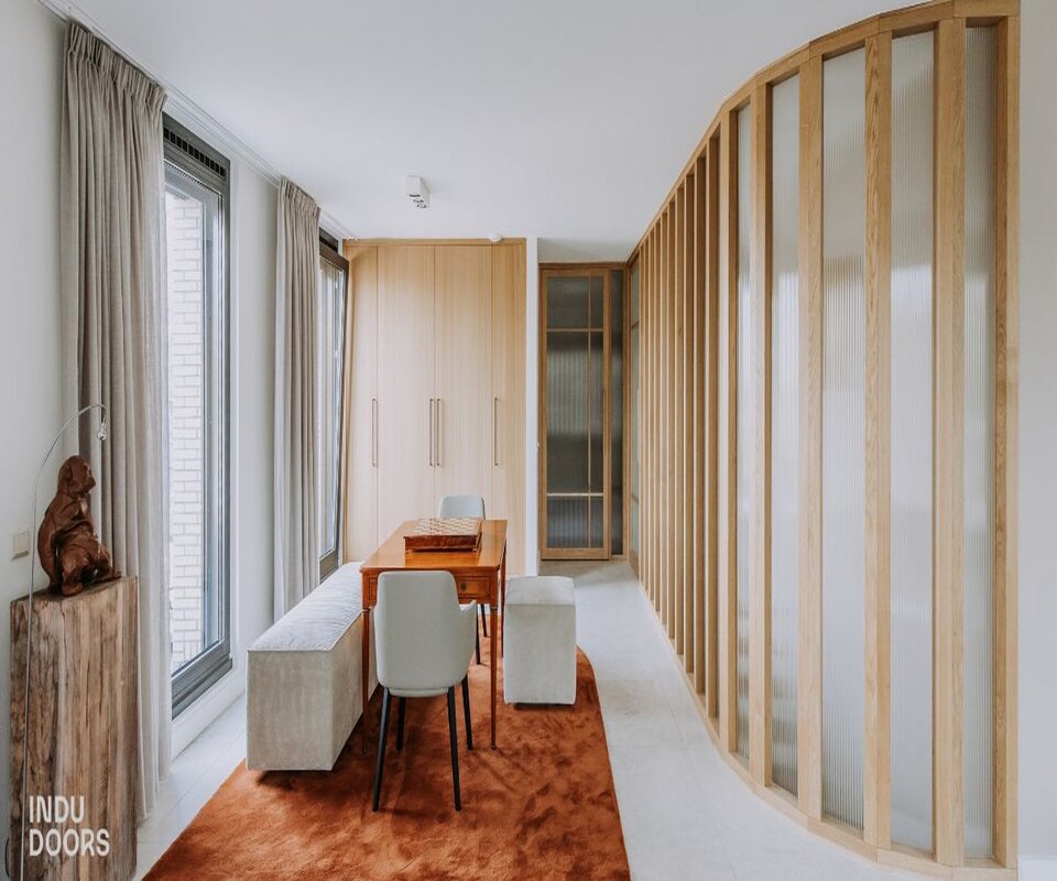 De plafondhoge eiken wand is voorzien van canale blank glas, dit soort figuurglas zorgt voor een beperkte doorkijk. Terwijl het licht behouden blijft.
