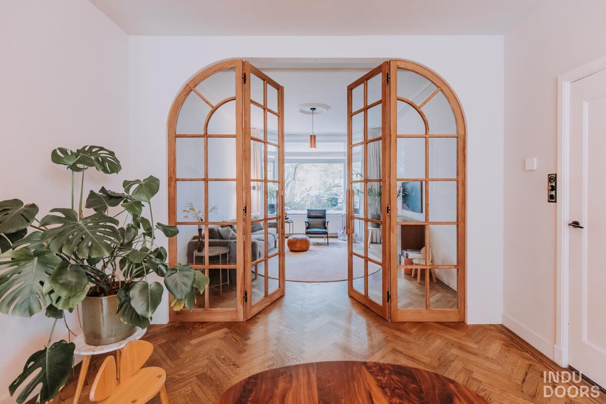 Door de ronde vaste zijlichten aan beide kanten, de getoogde en doorlopende roedeverdeling, prachtige dubbele taatsdeuren in het midden van de eikenhoutenwand en aansluitend de eiken grepen vormt het zich tot één eindeloos en exclusief geheel.