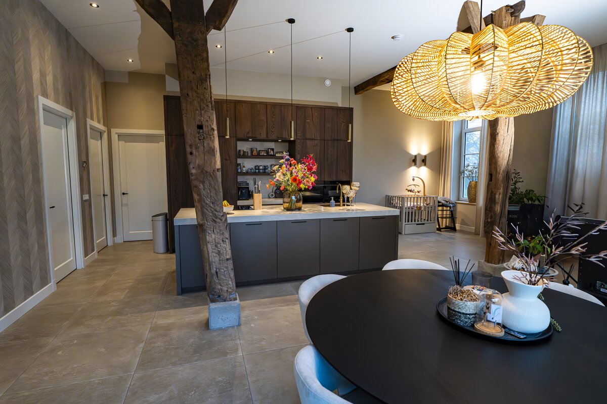 In deze exclusieve leefkeuken gaan strakke, moderne lijnen harmonieus samen met authentieke elementen zoals robuuste houten balken en karaktervolle kolommen. Deze historische accenten geven de ruimte een ziel, terwijl de minimalistische vormgeving van de keuken rust en evenwicht biedt. De donkere houten kastenwand fungeert als visueel anker en contrasteert elegant met het lichte werkblad, waardoor een tijdloze uitstraling ontstaat die zowel warm als verfijnd is.