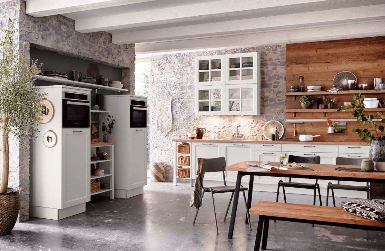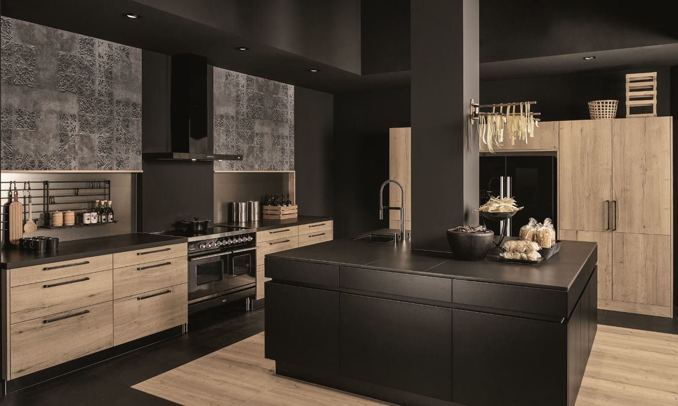 Hout speelt de hoofdrol in deze trend. De totale interieursfeer loopt van de zitkamer naadloos over in de keuken. De modern-landelijke keuken heeft een natuurlijke serene en stoere feeling. Houtfineer als wanddecoratie is een nieuwe trend en dit wordt gecombineerd met een leem gestucte wand en vlakke strakke vloeren zoals de betonlook of een natuursteenlook. In de keuken wordt gespeeld met verschillende materialen en structuren waaronder grafische ribbelstructuren, grote houtstructuren en steenoptieken met een reliëf.