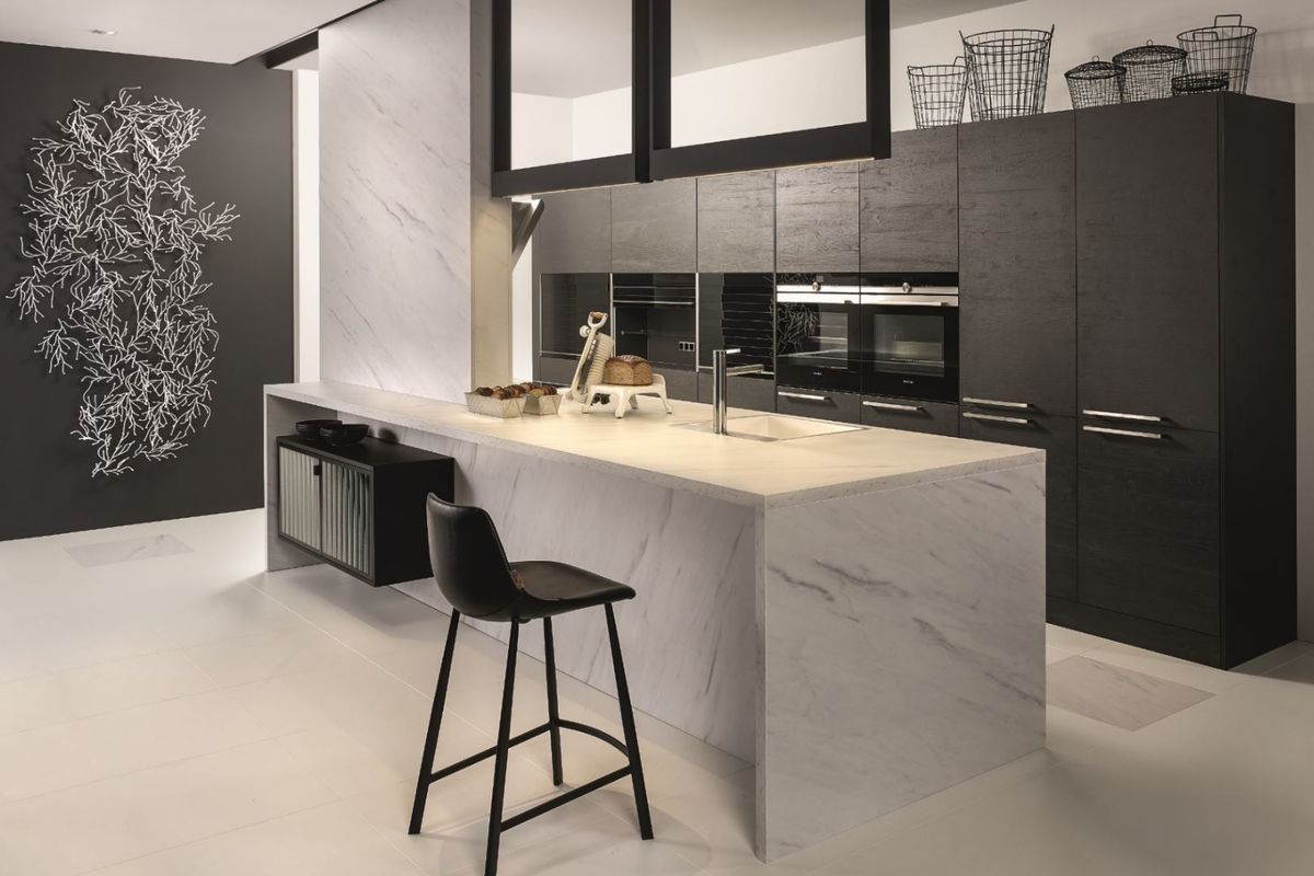Natuursteen is van oudsher een luxe element in de keuken. Het is echter nieuw dat dit materiaal de boventoon voert in een keukenontwerp. De trend Sereen Steen ademt een monumentale uitstaling met natuurlijke kleuren. Marmer of marmerlook materialen staan centraal. Het symmetrisch plaatsen van een nis met designapparatuur in een wandvullende kast is een trenditem in de keuken. Speel met ledverlichting om de nis een ware eyecatcher te maken. De combinatie van steenoptiek op de keukenfronten en een zwevend tafelblok zorgen voor een warme sfeer.