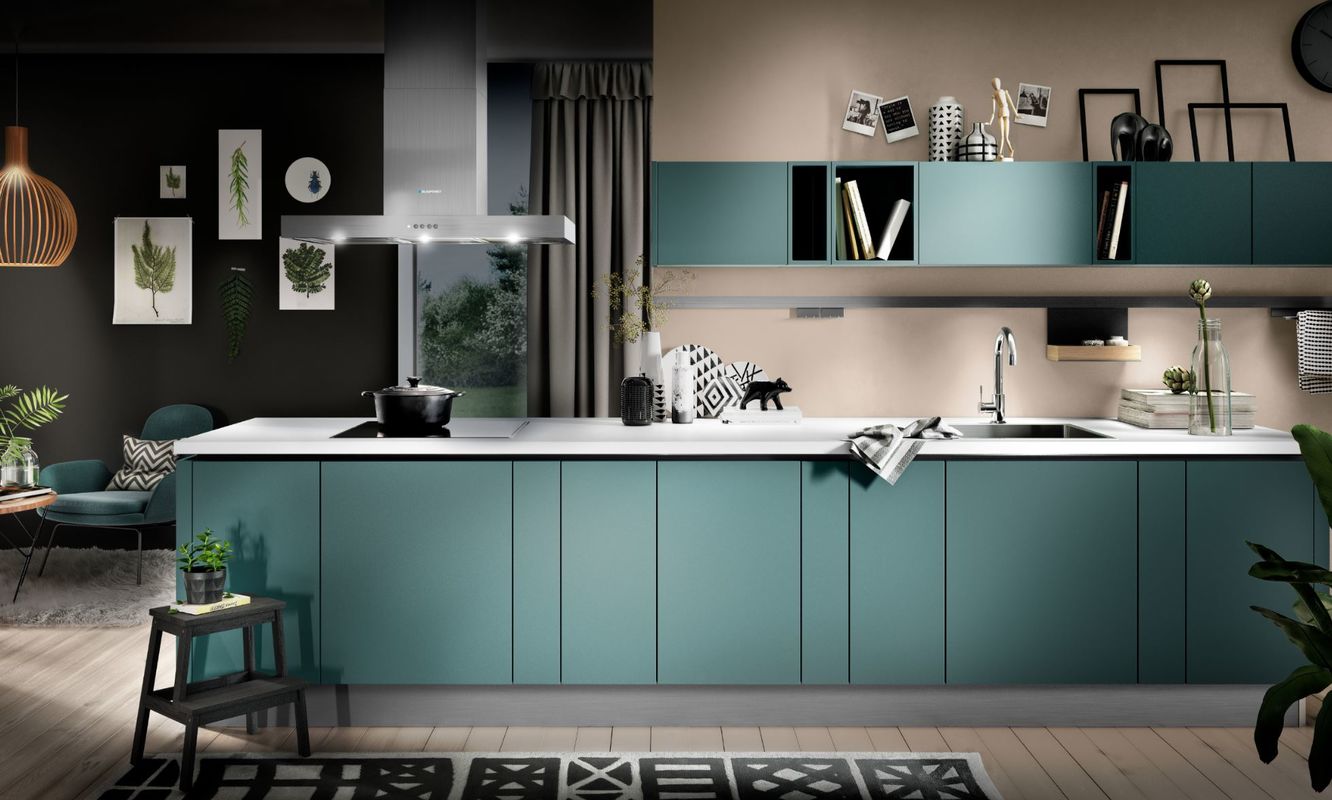 Werken met contrasterende kleurvlakken in de nieuwste trendkleuren is de formule voor Colorblock. Een gedurfde trend! Bij toepassing van deze trend ontstaat een grafisch beeld dat doet denken aan abstracte, moderne kunst. De basis voor de keuken in deze trend is wit. In de keuken worden vervolgens vijf verschillende gekleurde fronts toegevoegd. In deze trend is de blauw kleur leidend. De kleuraccenten worden toegevoegd met oranje, zalm, roze en knalgroen.