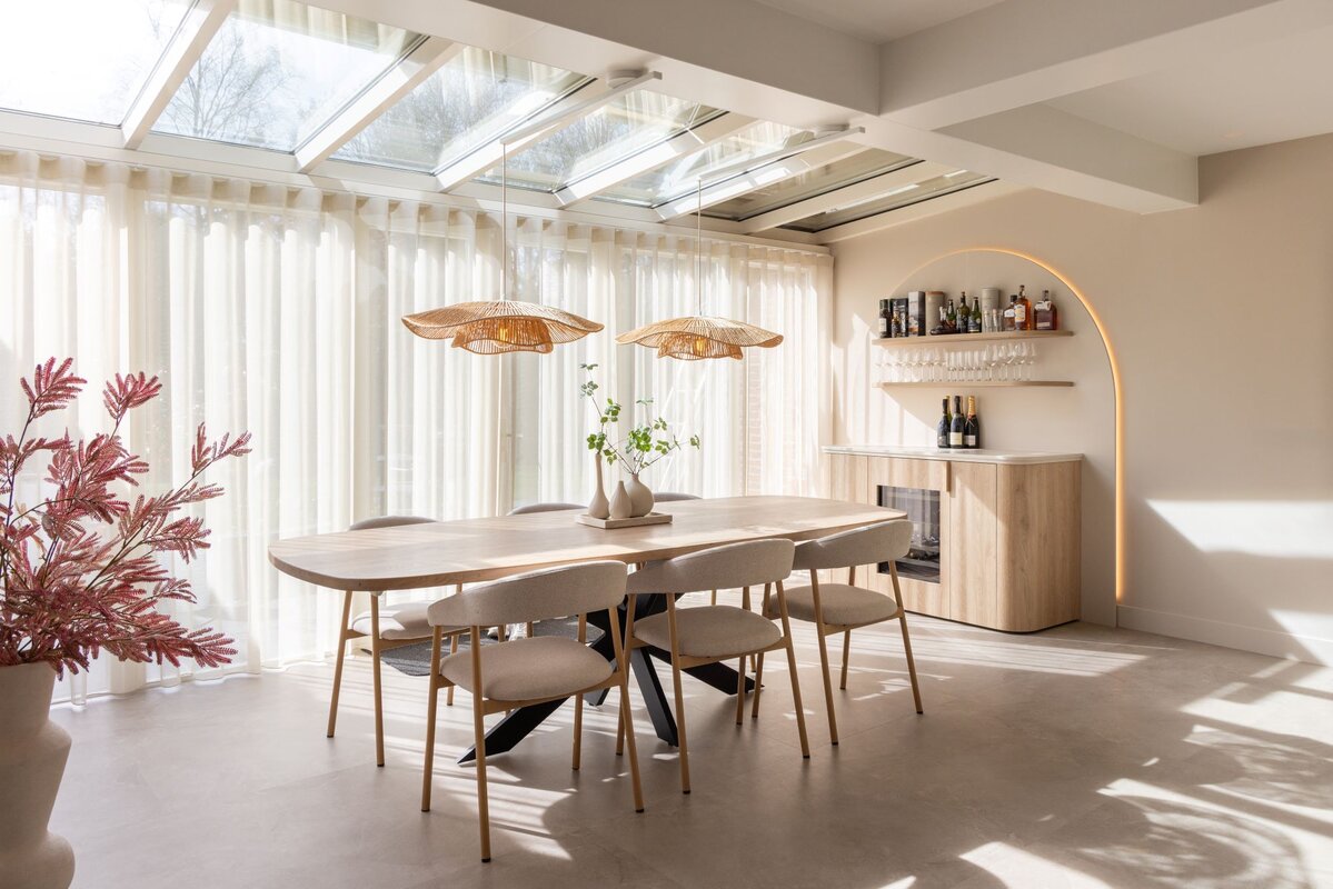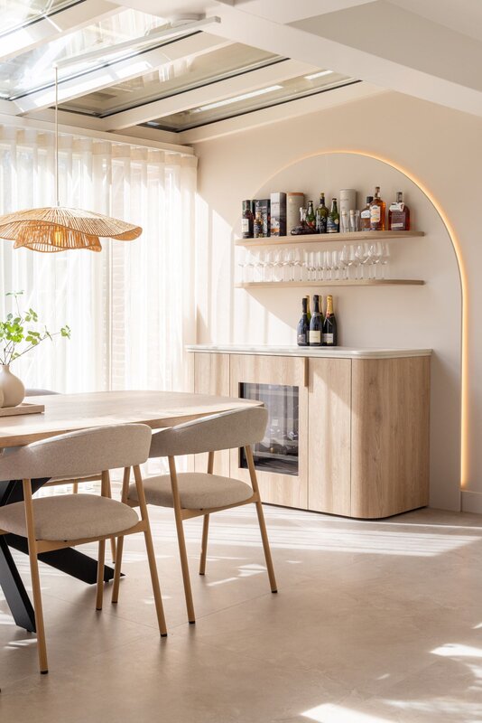 In deze exclusieve keuken van NDR Keukens smelten warmte, rust en functionaliteit moeiteloos samen tot een uitnodigende leefruimte. Met oog voor detail en een verfijnde esthetiek, ontstaat een omgeving waarin natuurlijke materialen en zachte kleuren het decor vormen. Licht hout, subtiele tinten en afgeronde vormen creëren een sfeer die zowel elegant als toegankelijk aanvoelt—aangenaam om in te koken, maar ook om in te leven.