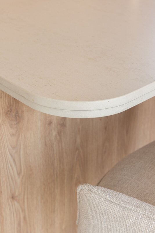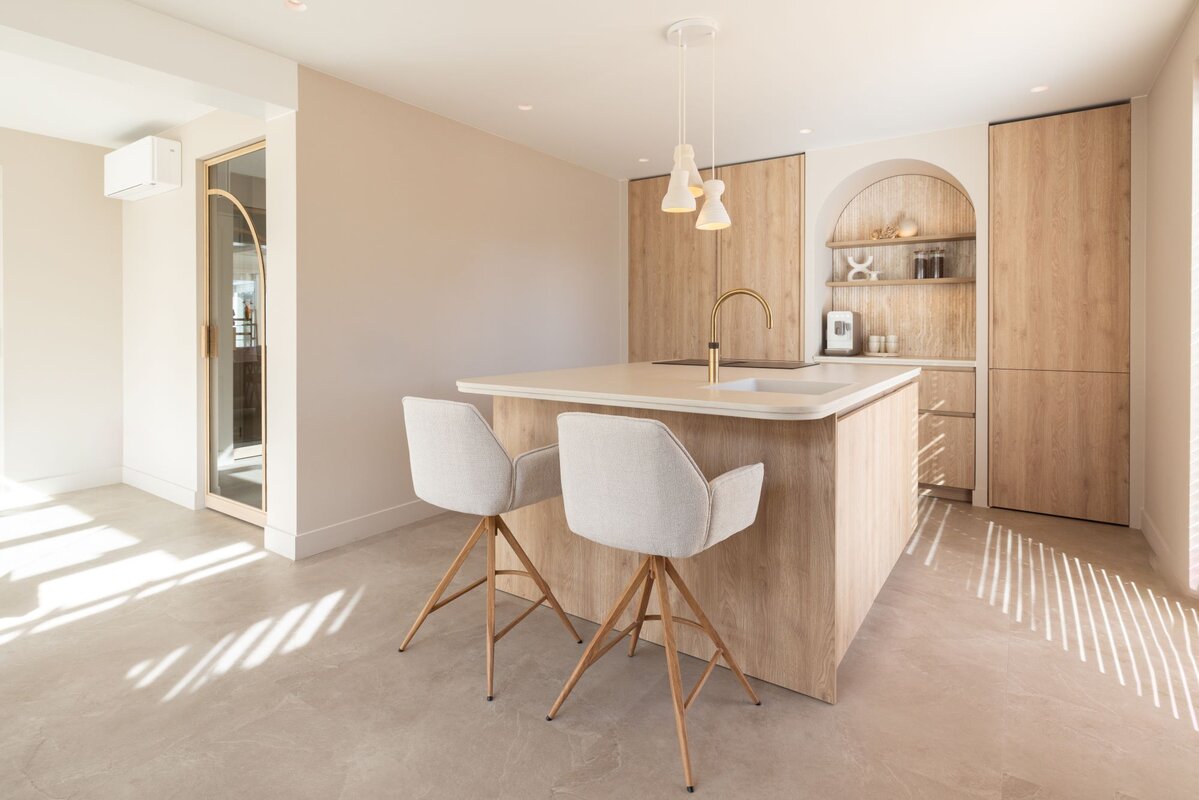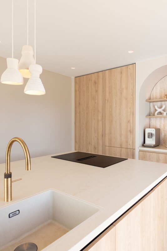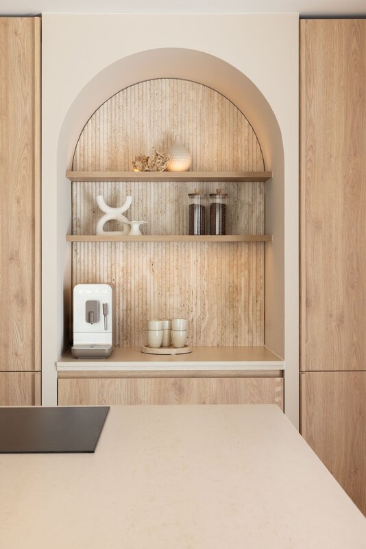 Het ontwerp schittert door de balans tussen natuurlijke houtstructuren en lichte kleuren, die samen een ruimtelijke en serene basis bieden. Maatwerk fronten versterken het tijdloze karakter van de keuken, terwijl het werkblad hier naadloos op aansluit en het minimalistische concept benadrukt. Het kookeiland, met zijn afgeronde vormen, voegt een zachte, verfijnde touch toe en sluit perfect aan bij het high-end karakter van de ruimte.