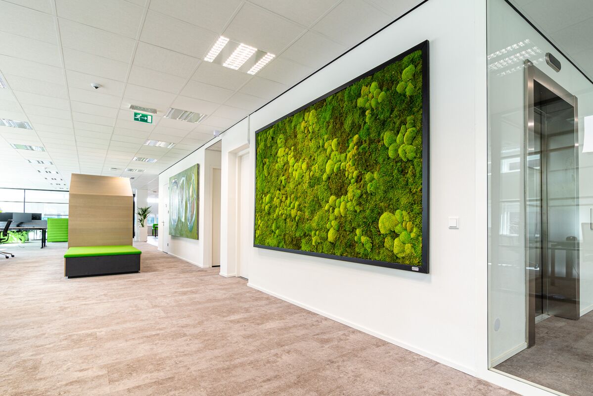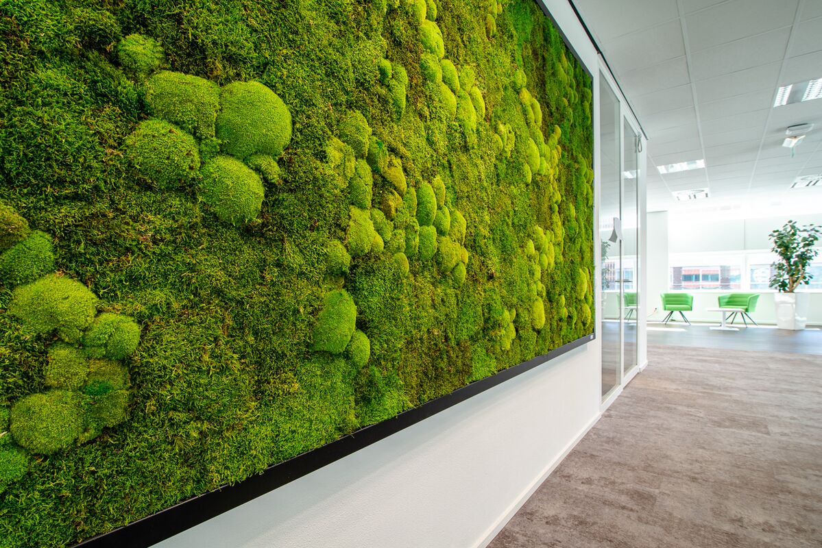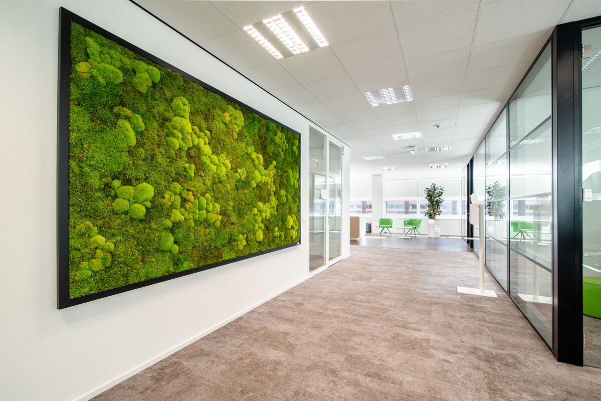 Dit mosschilderij zorgt voor een goede akoestiek in het kantoor en zorgt voor prachtig groen aan de muur door een combinatie van verschillende soorten mos.