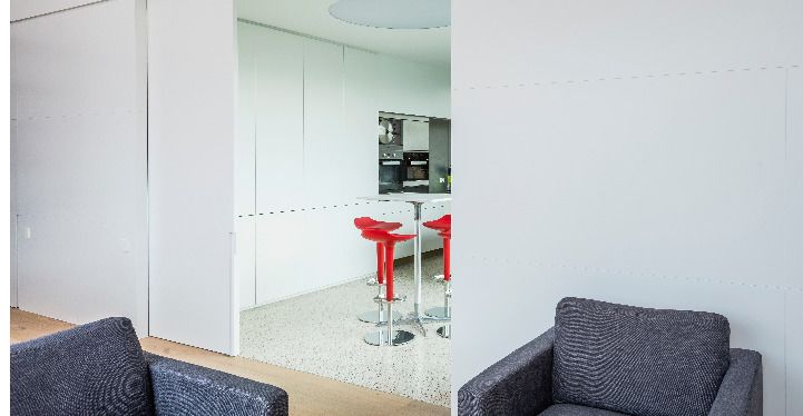 Deze woning is daar geen uitzondering op. Om tussen de keuken en woonkamer het grote muuroppervlak te kunnen vrijhouden voor de verdere inrichting, was het nu eenmaal opportuun om de schuifdeuren in de muren te laten verdwijnen bij het openschuiven. Zelfs met de schuifdeuren open blijft de wand volledig vrij, terwijl je beide ruimtes toch steeds van elkaar kan scheiden.