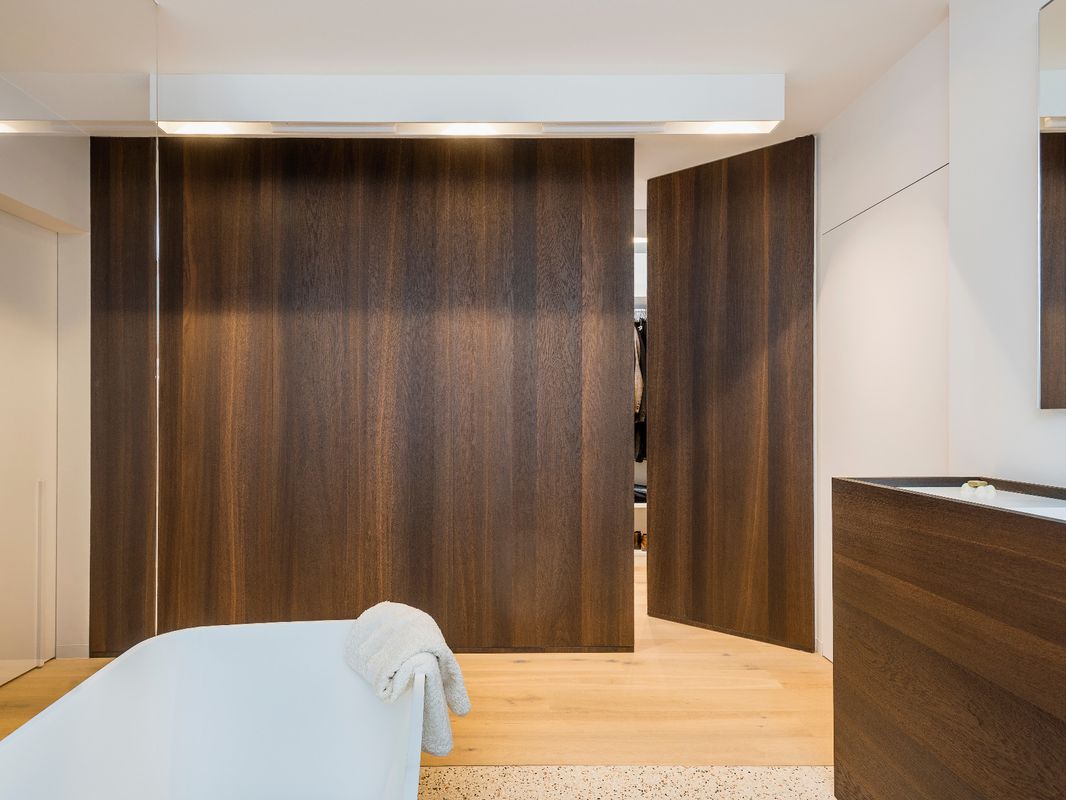 De keuze voor pivoterende binnendeuren is volgens Thomas Nachtergaele vooral een esthetische keuze. Ook hier was dat het geval voor de wand die de dressing van de badkamer scheidt. Uniform afgewerkt met de wand geeft dat dan ook een fraaie aanblik, zelfs met de pivotdeur open. “Toch komt in veel ontwerpen een mix van de verschillende deurbeslagsystemen voor draai-, pivot- en schuifdeuren aan bod,” vertelt hij er volledigheidshalve bij.