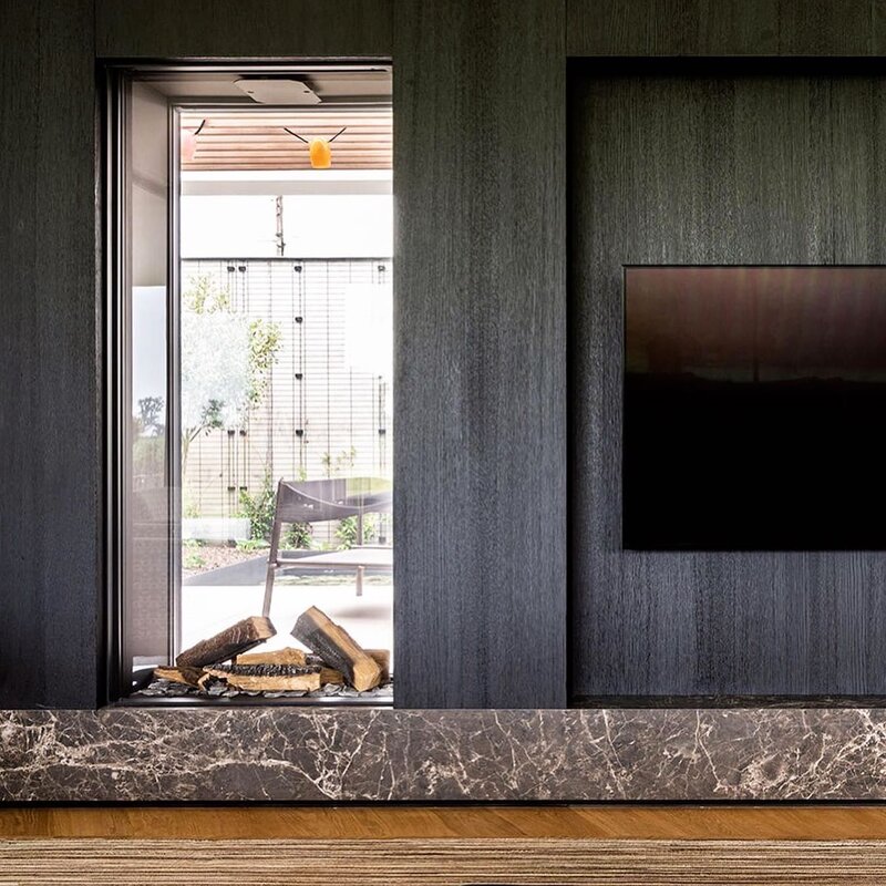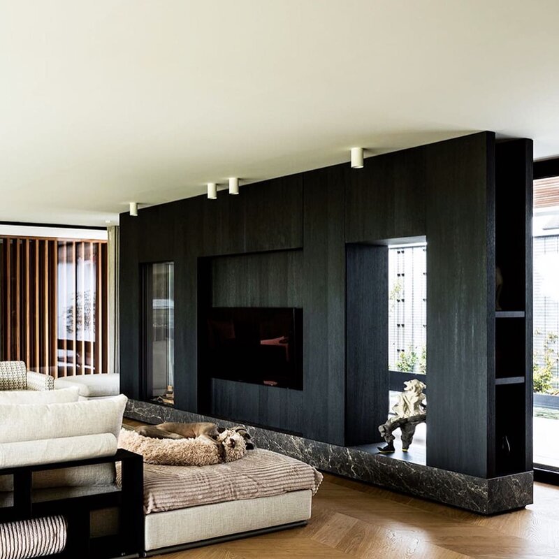 𝗛𝗼𝘁𝗲𝗹 𝗰𝗵𝗶𝗾𝘂𝗲 in eigen huis. Deze prachtige roomdivider is gemaakt van eiken fineer en bruin marmer. Met geïntegreerde haard en televisie. Een heel mooi voorbeeld wat maatwerk voor een interieur kan doen.