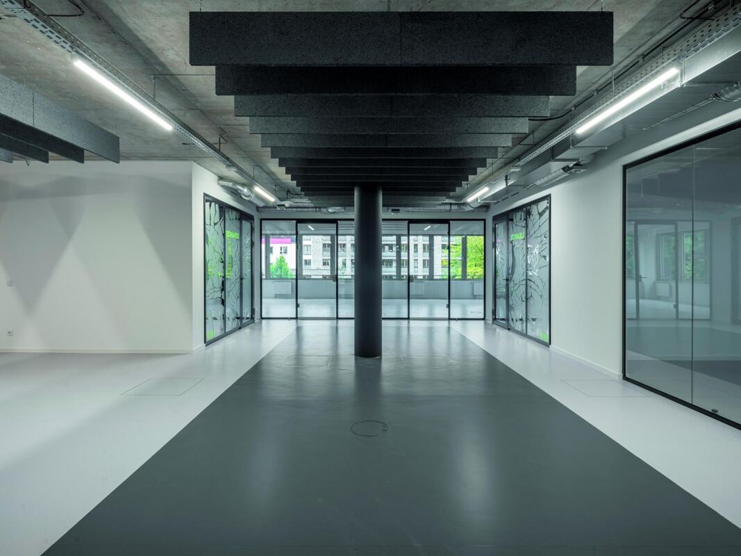 Individuele materiaal-, kleur- en grafische werelden werden ontwikkeld voor de ruimtes van de afzonderlijke startup-teams, en worden gekenmerkt door aangepaste gebruiks- en ontspanningsmogelijkheden en hebben een inspirerende werking op het creatieve werk. ‘Over het geheel genomen is de ambiance niet overladen, maar gericht op objectieve eisen, aangevuld met coole designdetails,’ legt Dipl.-Ing. Grit Ruschinzik, binnenhuisarchitect bij BAID, uit. Wat de inrichting betreft, werd het project eveneens ontwikkeld volgens de nieuwste normen om te voldoen aan de specifieke eisen van het bedrijfsleven en aan de specificaties voor flexibiliteit van de werkplekken. Het project leeft door de heldere ruimtelijke structuur en de spannende combinatie van pure, eenvoudige materialen, gekoppeld aan een deels intense kleurigheid en grafische elementen.