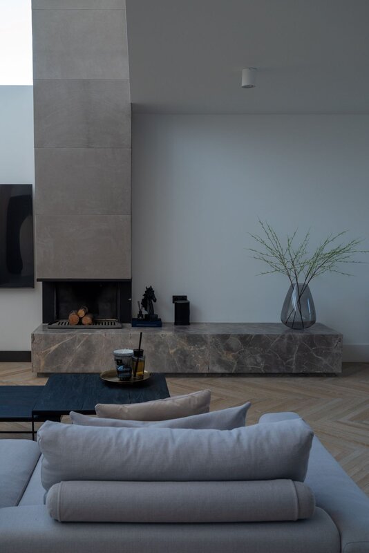 combinatie van hout en steen loopt door in de vloer en de aangrenzende bijkeuken, waardoor de hele ruimte een serene en samenhangende sfeer krijgt.