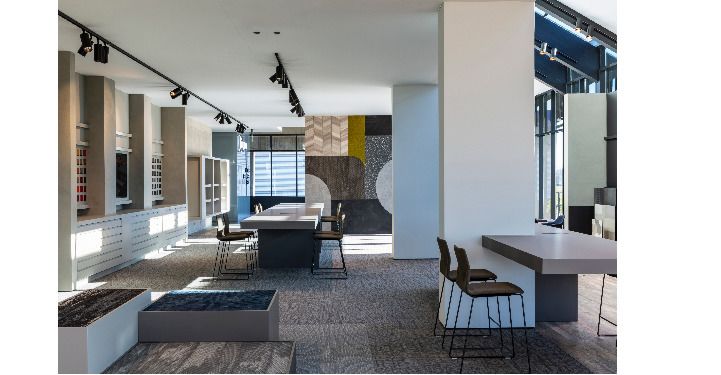 Deze ruimte is enkel met behulp van materialen en designelementen onderverdeeld in zones. Bezoekers worden intuïtief van de ene naar de andere zone geleid om kennis te maken met het hele IVC-assortiment. “Om te beginnen”, merkt Glenn op, “hebben we in de Commercial Library aanpasbare moodboards en units voor productstalen op de gestripte betonmuren. Onze bezoekers kunnen ook even verpozen in de coffeecorners, wat bijdraagt tot de informele, inspirerende vibe in het Flooring Development Centre. Bovendien hebben we verschillende contrasterende vloeren gecombineerd tot een harmonieus geheel, dat makkelijk kan worden aangepast om de nieuwste IVC-vloeren in de kijker te plaatsen. Voor een unieke look hebben we zelfs vloerbekleding op de muur gebruikt. We zijn ook aan de slag gegaan met het idee van ‘artificial realness’ door als het ware een dialoog te creëren tussen de vinylvloeren en de betonnen muren en pijlers.”