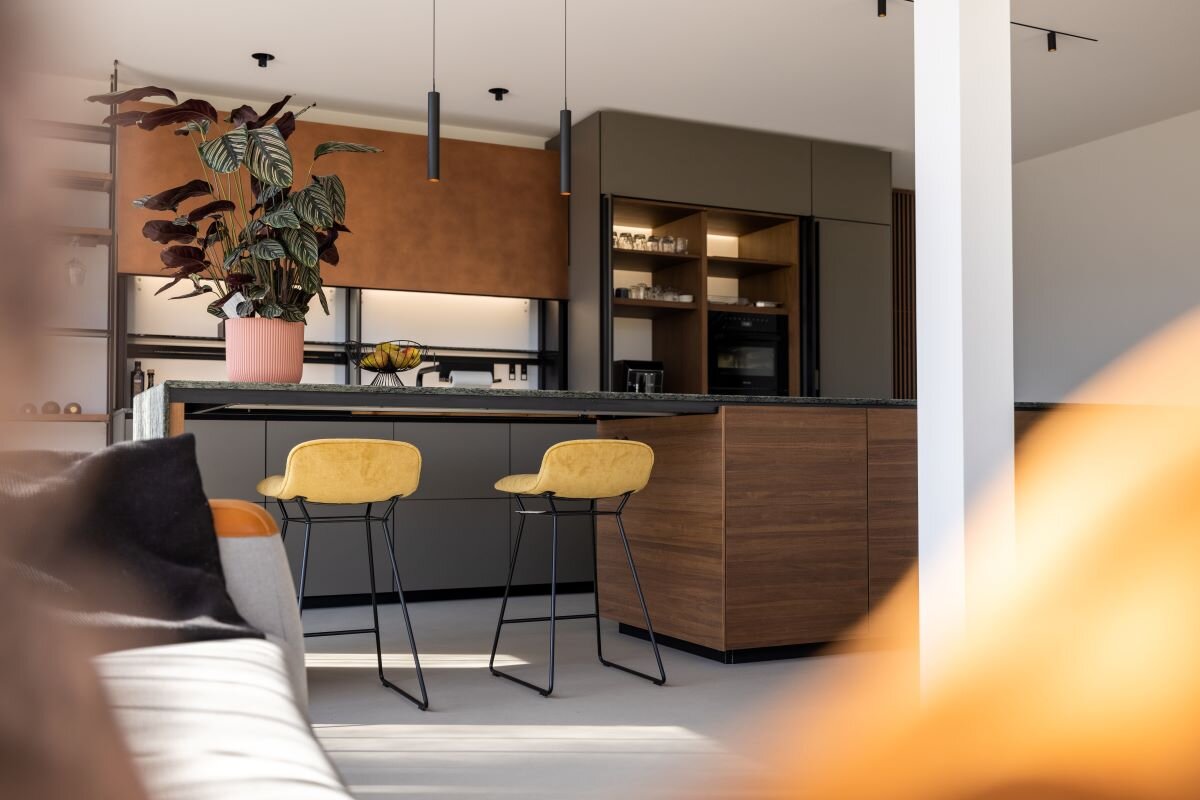 Deze keuken heeft een moderne, minimalistische stijl met warme accenten. De strakke lijnen en het gebalanceerde kleurenpalet geven de ruimte een verfijnde uitstraling, terwijl natuurlijke materialen zoals hout en steen een gevoel van warmte en exclusiviteit toevoegen. Deze benadering past perfect binnen de trend van ‘tactiele luxe’, waarbij hoogwaardige materialen en texturen centraal staan. Het resultaat is een ruimte die uitnodigt tot koken, ontspannen en samenzijn, zonder concessies te doen aan design of functionaliteit.
