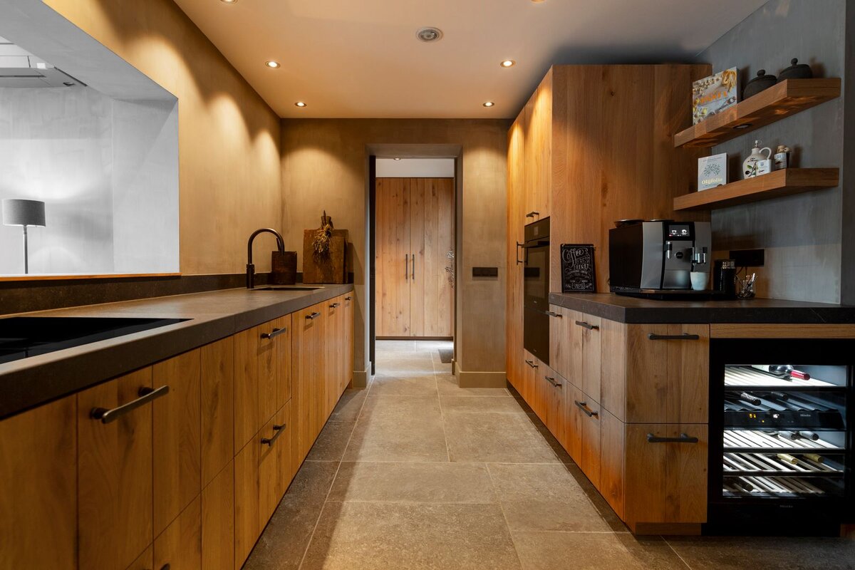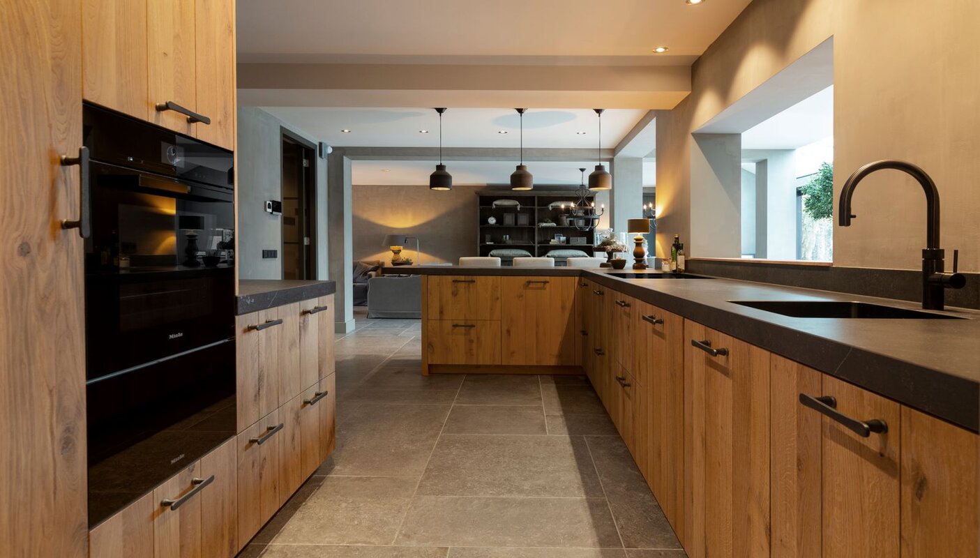 Een belangrijke trend in keukenontwerpen is ‘natuurlijke luxe’: een verfijnde mix van hoogwaardige, organische materialen met een elegante afwerking. Deze keuken omarmt die trend volledig. Het gebruik van echt hout brengt de natuur in huis en creëert een warme ambiance, terwijl de donkere accenten en subtiele verlichting de exclusieve uitstraling versterken. Duurzaamheid speelt ook een grote rol: de materialen zijn van topkwaliteit en zijn ontworpen om jarenlang mee te gaan. Dit is een keuken die niet alleen vandaag indruk maakt, maar ook in de toekomst zijn stijl behoudt.