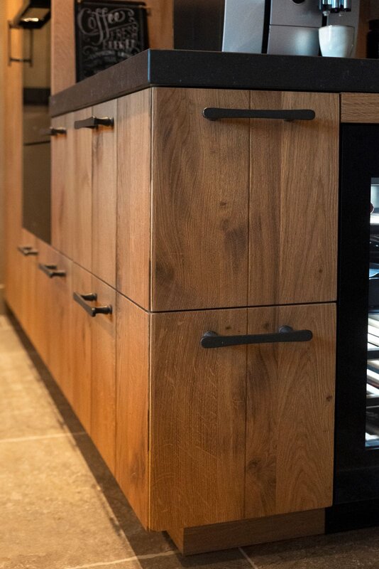 De combinatie van natuurlijke materialen en strakke lijnen maakt deze keuken een prachtig voorbeeld van de landelijk-moderne stijl. De warme houtstructuur creëert een uitnodigende sfeer, terwijl de industriële elementen, zoals de zwarte accenten en minimalistische grepen, een stoere en eigentijdse uitstraling geven. Het contrast tussen robuust en verfijnd maakt deze keuken perfect voor liefhebbers van tijdloos design met een moderne twist. Of uw interieur nu klassiek of eigentijds is, deze keuken past zich naadloos aan uw woonstijl aan.