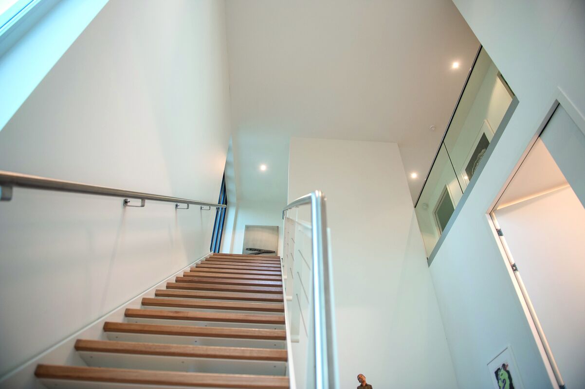 De plafonds van de keuken op de begane grond en van de slaapkamers op de eerste verdieping hebben ook ingebouwde, dimbare ledarmaturen. Alleen in de badkamer zijn ze niet dimbaar. In de wand van het balkon op de eerste verdieping is ook dimbare ledverlichting geïnstalleerd. De ledarmaturen inclusief drivers in de keuken en de slaapkamers hebben een speciale anti-reflectiezone, die bijdraagt aan een aangename lichtbeleving. De reflectoroptiek zorgt voor een mooie lichtdistributie. De armaturen zijn richtbaar en hebben elk een vermogen van 9 watt, vergelijkbaar met een halogeenlamp van 50 watt. Ook hier is de lichtkleur warmwit.