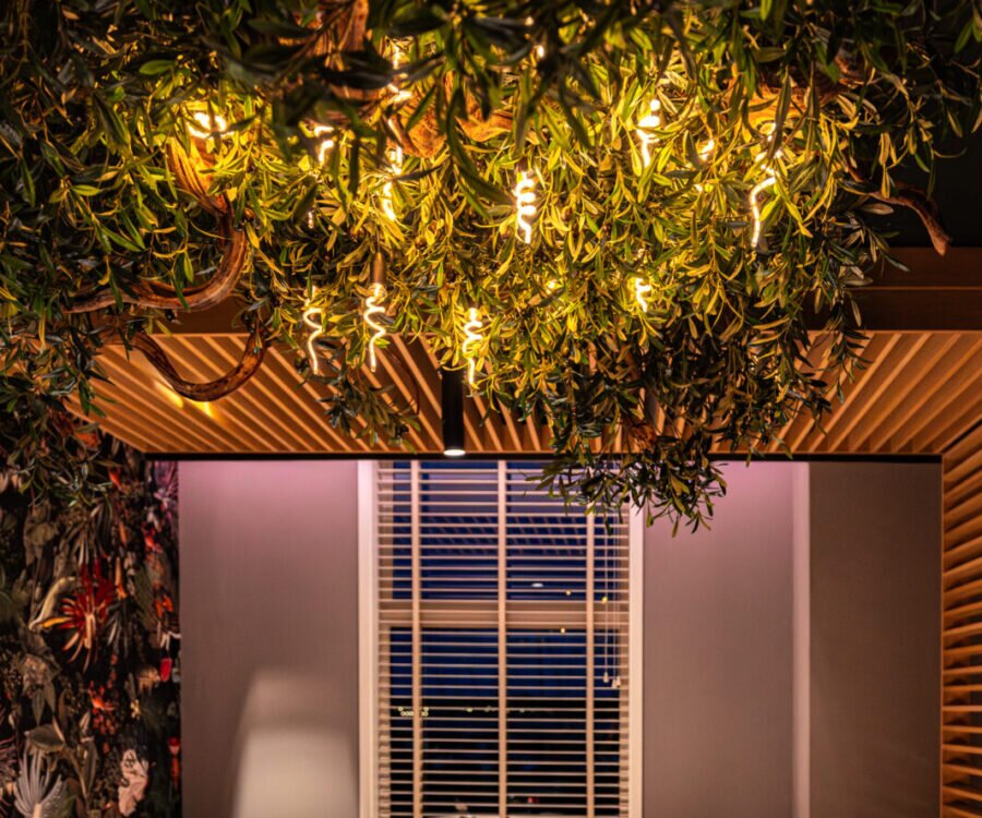 Langs het plafond is een koof met een subtiele led-strip geplaatst, die zorgt voor een zachte indirecte verlichting. Een bijzonder detail is de uitlichting van de raamkozijnen met de “Trick” armaturen van iGuzzini. Deze creëren een prachtige omlijsting van het kozijn en versterken zowel binnen als buiten de Door het gehele restaurant zijn zwarte opbouwspots van Modular geïnstalleerd om kunstzinnige objecten en interieurdetails te accentueren. In de entree is als eyecatcher gekozen voor de “Leaf” van Loomiosa. een armatuur dat direct de aandacht trekt en een uitnodigende indruk achterlaat. sfeer.