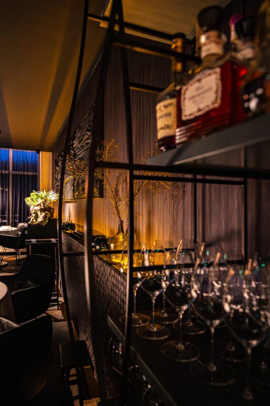 Bij binnenkomst valt direct de intieme en luxueuze uitstraling van het restaurant op. De bewuste keuze voor een donkere ambiance laat het prachtige witte tafellinnen schitteren onder de zorgvuldig geplaatste spots, waardoor de verlichting een prominente rol krijgt in de ruimte.