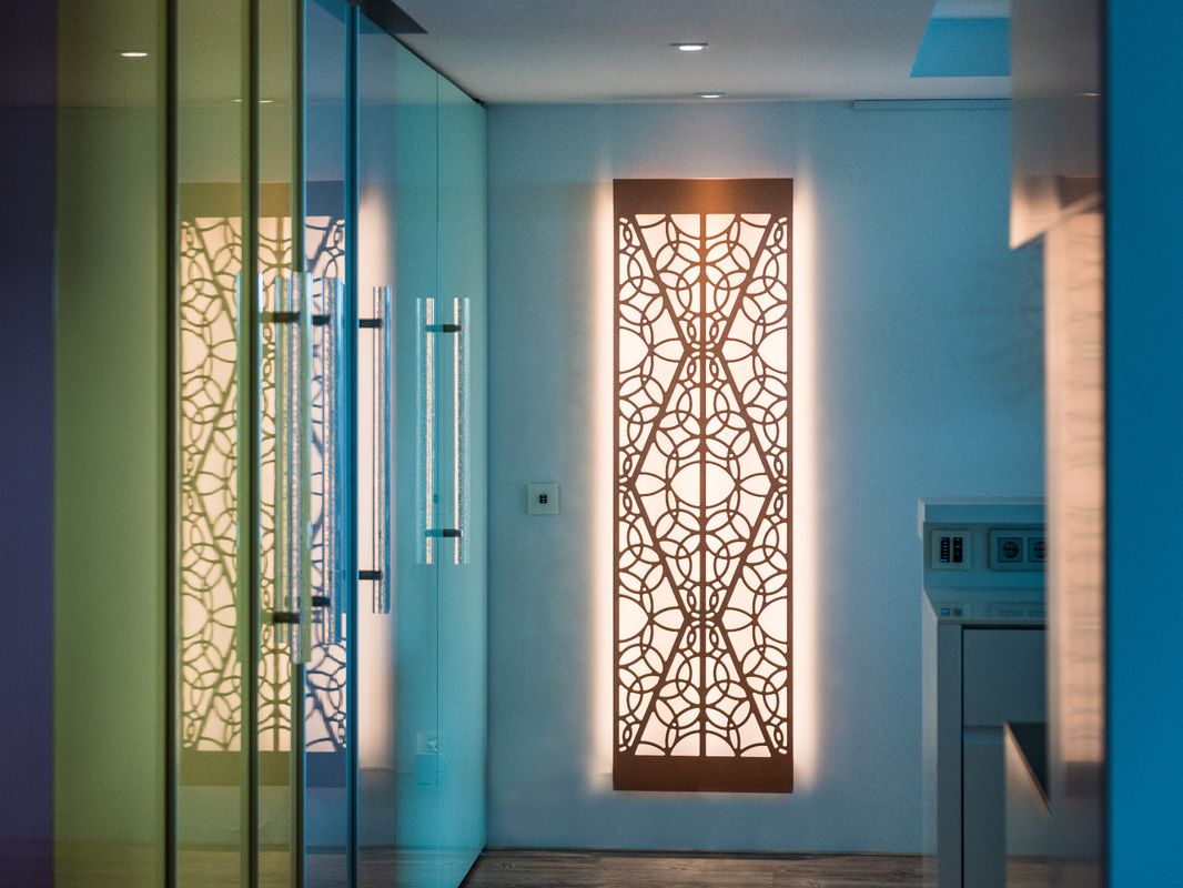 ‘Voor de verbouwing was de verlichting in ons huis slecht. Juist daarom hebben we tijdens de verbouwing alle focus op licht gelegd. Of eigenlijk deden we dat al voor de werkzaamheden begonnen, zodat we precies wisten waar het leidingwerk moest worden weggewerkt. De grote muur midden in onze woning zette me aan het denken. Was het een plek voor kunst of voor licht? Of voor beide? En zo is het idee voor KuvaLight, een verbastering van kunst van licht, geboren. Inmiddels hebben we een assortiment met vijf designs, uitgevoerd in verschillende materialen.’ Jacqueline is ontwerper én maker van de KuvaLight-designs. ‘Ik snij en frees niet zelf hoor, dat laat ik doen, maar ik zet alle lampen wel persoonlijk in elkaar. We hebben veel aandacht besteed aan het ophangsysteem van KuvaLight. Het ophangen van designlampen is vaak nogal een dingetje, ons systeem daarentegen is eenvoudig en zorgt bovendien voor de juiste afstand tot de muur zodat het licht een mooi aura heeft.’ KuvaLights zijn compatibel met Philips Hue, DMX en andere lichtcontrole- en domoticasystemen. ‘Je bedient de lampen eenvoudig via een app. Daarin bepaal je zowel de kleur als de intensiteit van het licht. Geef je een feestje? Je kunt de verlichting laten dansen op de beat van de muziek. Overigens zijn de lampen ook prachtig wanneer ze uitstaan.’