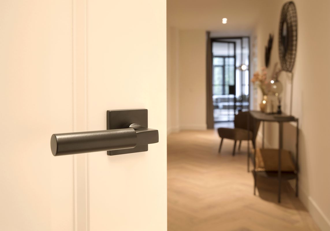 is ervoor gezorgd dat het gebouw toekomstbestendig is. Iedere woning is uniek en heeft een lay-out die aansluit bij de vorm van het gebouw. Vanzelfsprekend voldoen de 43 appartementen aan alle comforteisen van de huidige tijd. Voor het deurbeslag heeft interieurarchitecte Saskia Roelofs-De Tombe geadviseerd om gebruik te maken van de Living Black-lijn van Intersteel. Roelofs-De Tombe: “De matzwarte Bau-stil deurkrukken passen qua stijl uitstekend bij de zakelijk-expressionistische stijl van het appartementencomplex. Ze hebben mooie rechte hoeken en een moderne zwarte finish. Het is Bauhaus, maar toch modern.” Intersteel leverde ook het zwarte veiligheidsbeslag met SKG*** keurmerk en de geborstelde rvs paumelle-scharnieren die bijdragen aan een stijlvolle, luxe uitstraling.