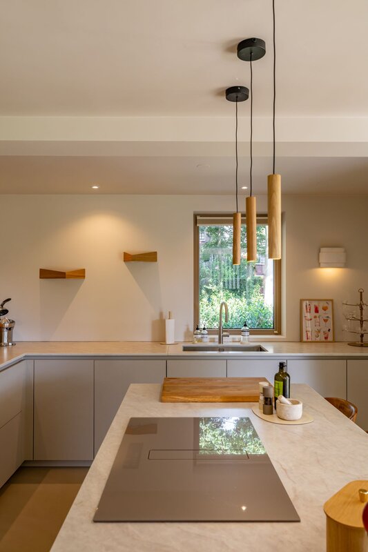 De serene uitstraling wordt bereikt door een zorgvuldig samengesteld palet van zachte tinten, lichte kleuren en natuurlijke materialen. Hier staat subtiliteit gelijk aan luxe. Greeploze fronten benadrukken het minimalistische karakter en geven de keuken een tijdloze elegantie. Het werkblad en de maatwerkkasten zijn perfect op elkaar afgestemd en zorgen voor een visuele rust die typisch is voor exclusieve keukens. Warme houtaccenten en verfijnde texturen brengen balans en nodigen uit tot een bijna vanzelfsprekend comfort.