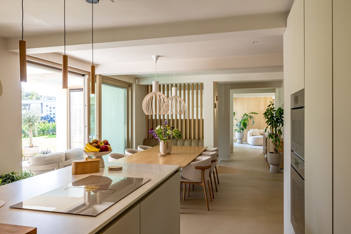 Het ontwerp schittert door de balans tussen natuurlijke houtstructuren en lichte kleuren, die samen een ruimtelijke en serene basis bieden. Maatwerk fronten versterken het tijdloze karakter van de keuken, terwijl het werkblad hier naadloos op aansluit en het minimalistische concept benadrukt. Het kookeiland, met zijn afgeronde vormen, voegt een zachte, verfijnde touch toe en sluit perfect aan bij het high-end karakter van de ruimte.