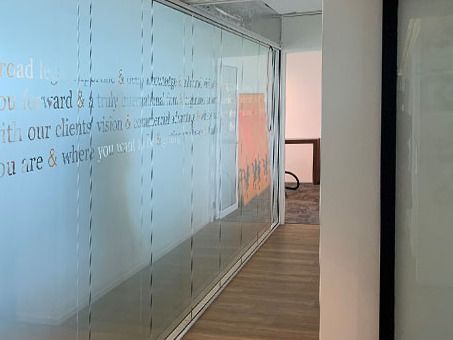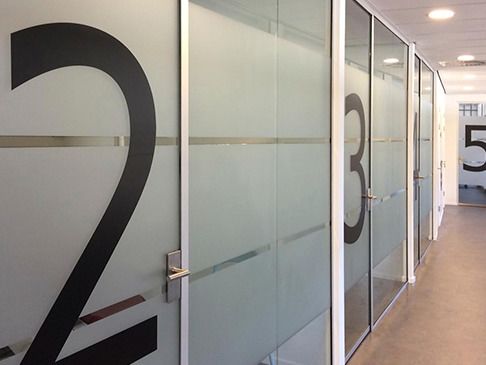 Ongeacht wat voor soort zaken uw bedrijf doet, het is prettig om een beetje privacy te hebben van buitenstaanders (vooral bij volledig ommuurde glazen kantoren of vergaderruimtes). Het gebruik van volledige panelen van geëtst vinyl als privacyfolie is één van onze specialiteiten als 3M Preferred Graphic Provider. Voeg uw bedrijfslogo, kamernummer/kamer naam of aangepaste ontwerp geëtst uit het vinyl toe (zoals op sommige van de foto's), of kies voor een van onze standaardontwerpen.