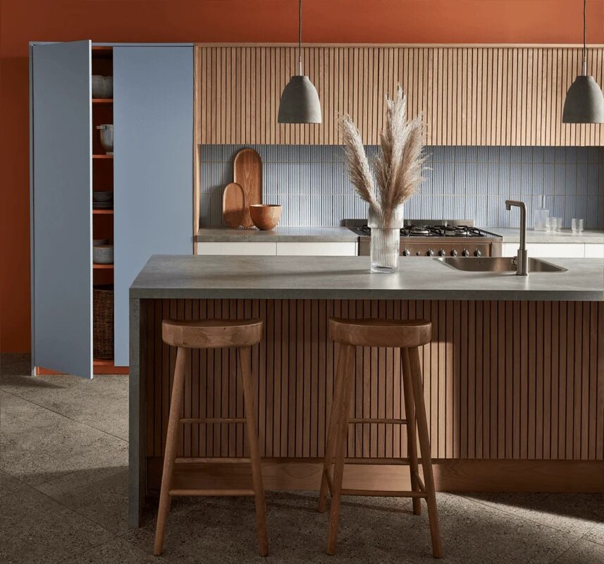 De kracht van deze trend ligt in het lijnenspel dat de keuken én het interieur met elkaar verbindt. Verticale structuren lopen door in plafonds, deuren en wanden, waardoor een gevoel van ritme en continuïteit ontstaat. Warme houttinten worden gecombineerd met actuele natuurtinten zoals terra, steenrood, hemelsblauw en groen. De matte afwerking en voelbare structuren versterken de natuurlijke uitstraling en maken van de keuken een zintuiglijke ervaring. Deze modern maar ook landelijke sfeer brengt rust, warmte en luxe samen op een ingetogen, stijlvolle manier.