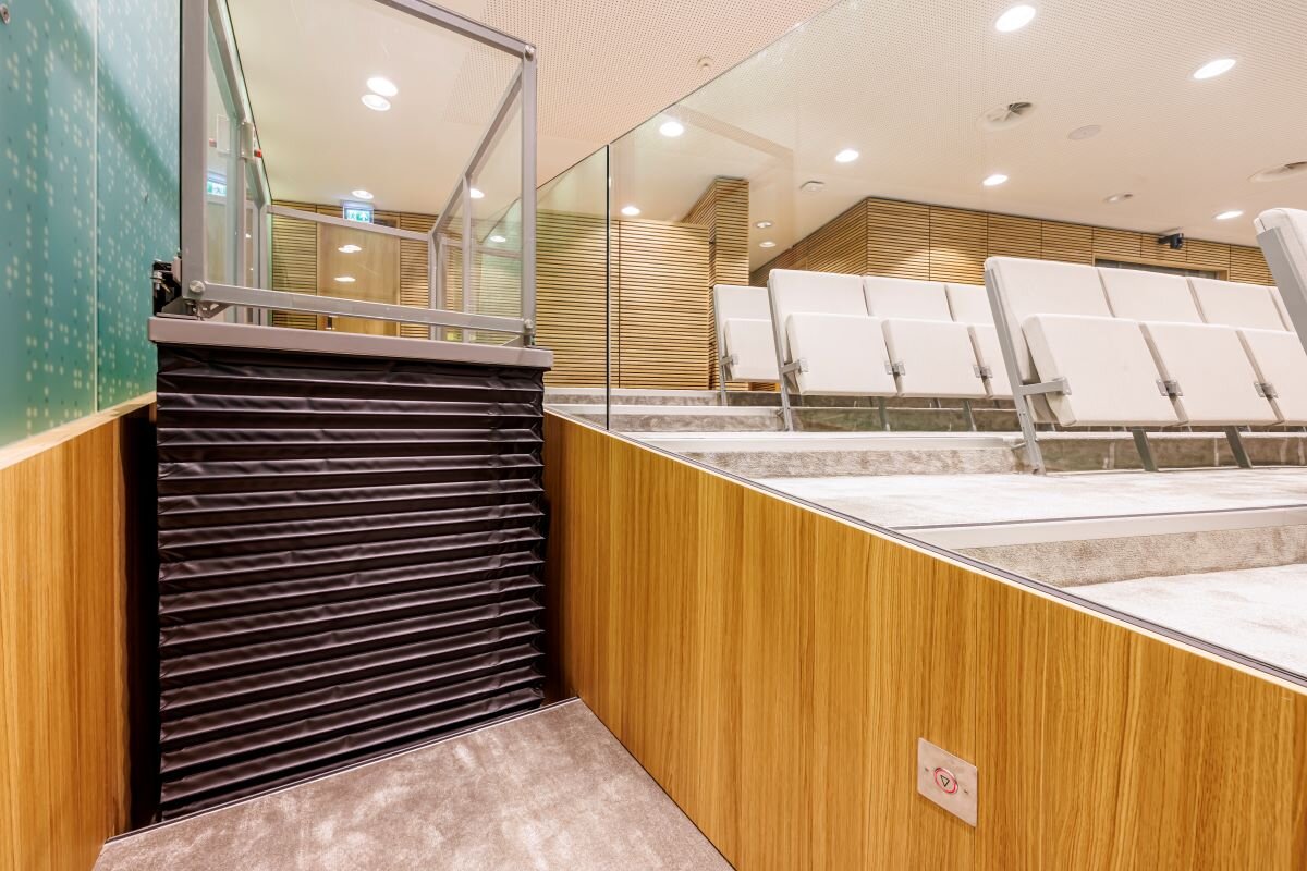 Defesche van den Putte werkte samen met Euroliften het plan uit om een rolstoellift in de zaal te krijgen. ‘De wens was om een rolstoellift te realiseren die rolstoelgebruikers vanaf de eerste verdieping naar het een-meter-twintig lager gelegen podium zou brengen. Een relatief goedkope kolomheffer was vanuit esthetisch oogpunt geen optie. Van het feit dat de kolom boven het vloerniveau zou uitsteken, werd de architect niet blij. Dat is ook volledig te begrijpen, want het zou het super strakke effect van de mooie glazen wand teniet doen. De optie om een schaarlift in te zetten, werd wel met gejuich ontvangen.’