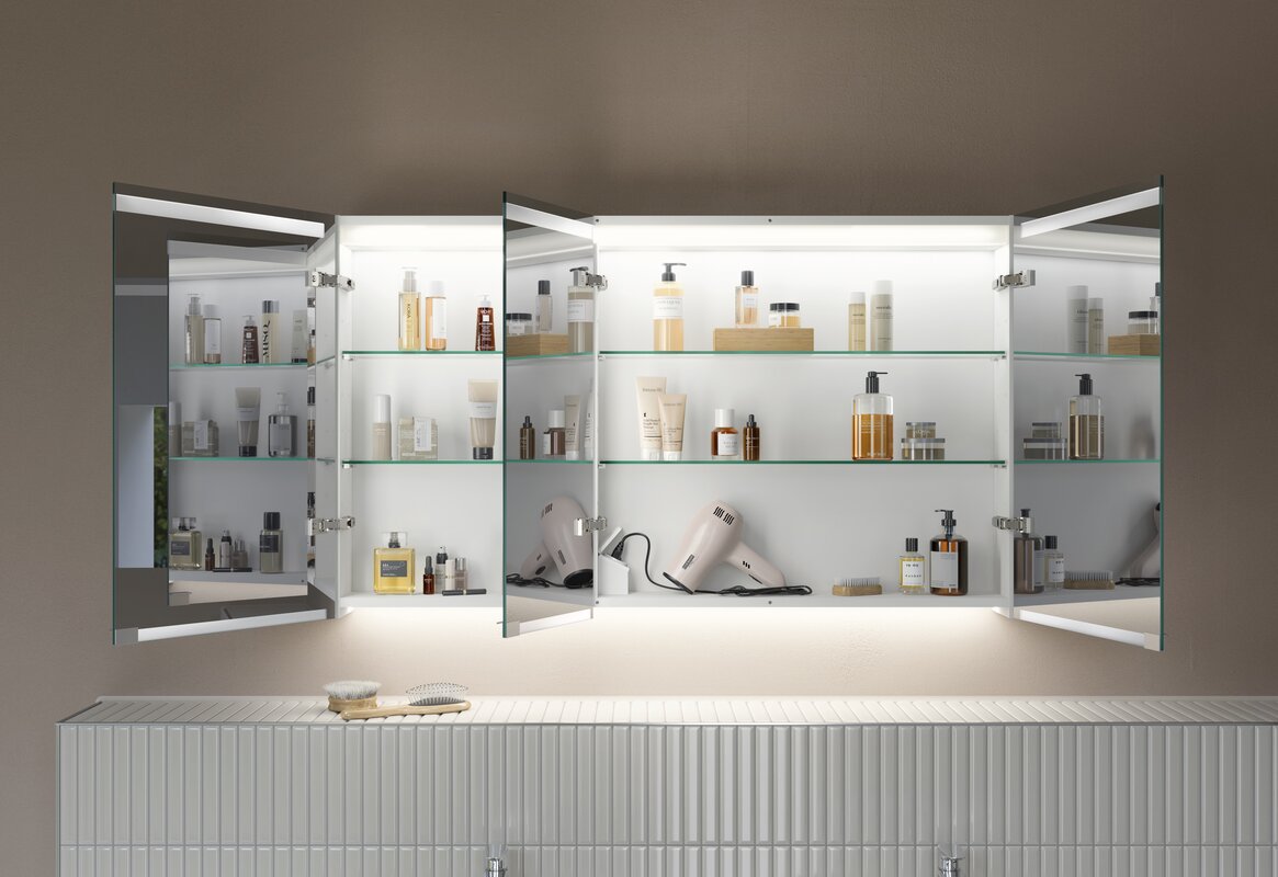 Nieuwegein, september 2025 - Stel je voor: je staat ’s ochtends met z’n tweeën voor de spiegel. De een brengt make-up aan, de ander scheert zich. Geen geduw of gewurm meer om een stukje spiegel te bemachtigen, want met de royale Geberit Option en Option Plus spiegelkasten van 120 cm breed heeft iedereen alle ruimte. Bovendien heb je al je verzorgingsproducten netjes binnen handbereik, overzichtelijk opgeborgen achter de drie spiegeldeuren die aan zowel de binnen- als buitenzijde volledig zijn bespiegeld.
