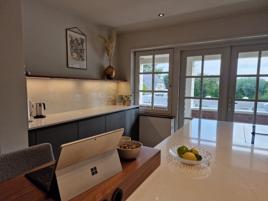 Voor de realisatie is gekozen voor het Duitse topmerk next125 – bekend om hoogwaardige materialen, strakke lijnen en minimalistisch design met karakter. De keuken van Jeroen en Sanne is uitgevoerd in donkere tinten gecombineerd met warme aardse kleuren, waardoor een elegante balans en rustgevende uitstraling is ontstaan. De greeploze fronten en het robuuste, natuursteenlook werkblad van Dekker versterken het luxe en moderne karakter.