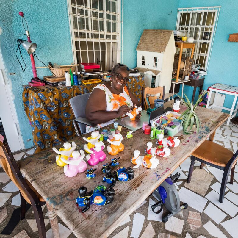 Lokale vakmensen, gespecialiseerd in zowel moderne als traditionele technieken, gieten de siliconen mallen met verschillende materialen als gips, epoxy en beton. Vervolgens worden de sculpturen gepolijst en afgerond. Dit alles vindt plaats in de factory, omringd door een prachtige tropische tuin waar toeristen het proces ook live kunnen aanschouwen. ‘Daarna brengen we de beeldjes thuis bij inmiddels 75 schilders verspreid over het eiland. Zij schilderen in huiselijke kring de beeldjes in hun eigen kleurrijke stijl. De bedoeling is dat zij zo uiteindelijk zelfstandig in hun levensonderhoud kunnen voorzien. Veel schilders komen vanuit een kansloze positie en beginnen zelfs zonder bankrekening. Ook in de gevangenis worden Chichi’s® geschilderd. Wij zijn niet degene om te oordelen, maar vinden dat iedereen een kans verdient. Daarnaast zijn er ook mensen met een goede baan die het schilderen juist als iets meditatiefs zien.’ Alle wanna-be-painters volgen eerst een schildercursus van Serena. Na de training bepaalt Serena met haar team of iemand aangenomen wordt. ‘We stimuleren vooral om te schilderen in je eigen stijl. Natuurlijk verkopen Chichi’s® met flamingo’s, iguanas, dolfijnen en palmbomen goed, maar ieder mag dat op zijn of haar eigen manier doen. Niks moet alles mag, natuurlijk wel volgens een aantal richtlijnen en regels. Na het schilderen worden de beeldjes in de factory afgewerkt en voorzien van het Chichi®-nummer van de schilder. Zo vind je als toerist of klant altijd beeldjes van jouw favoriete schilder. En jij doet ertoe, je bent een Chichi®-schilder en je hebt een hashtag. Het idee achter de Chichi’s® is eigenlijk dat je binnenshuis geld kunt verdienen, terwijl je ook voor je kind(eren) zorgt. Tevens hoef je op deze manier geen gebruik te maken van het openbaar vervoer, dat op het eiland een groot probleem is. En natuurlijk geldt dat schilderen rustgevend is en een heilzame werking heeft. Mijn Duitse roots zie je terug in het handwerk, made in Germany. Daar heb ik made in Curaçao van gemaakt. Ik ben trots, ontzettend trots op wat ik met mijn team heb neergezet.’