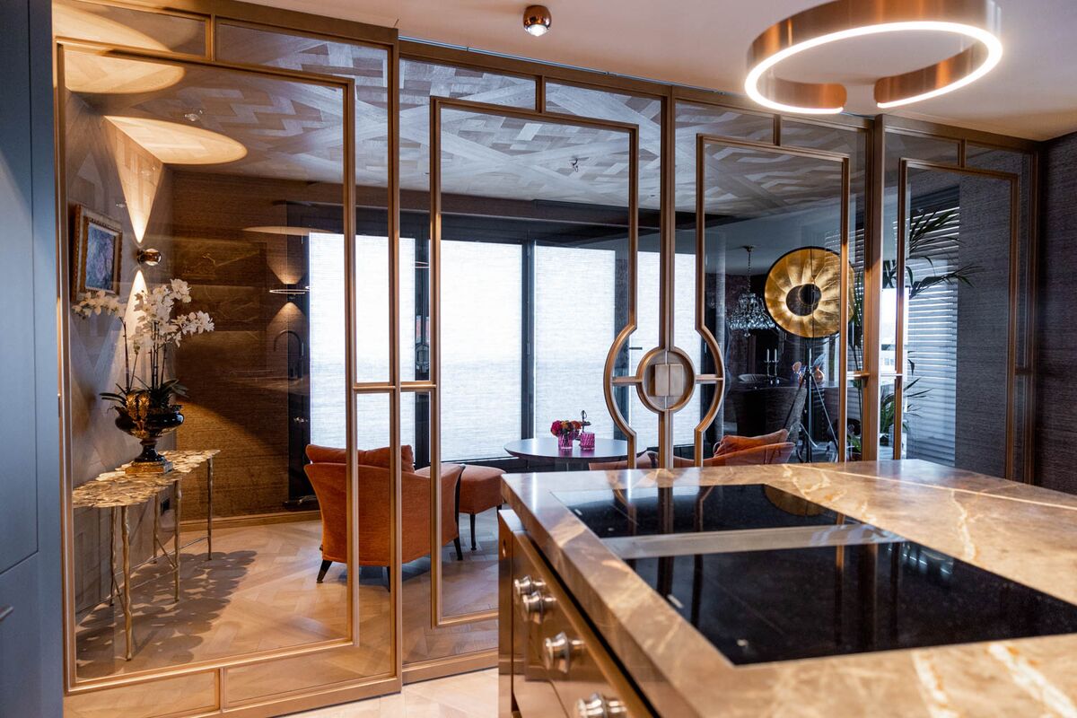 In de woonkamer van deze sfeervolle woning separeren een set dubbele stalen schuifdeuren de zitkamer van de luxe maatwerkkeuken van Van Essen Keukens. De keuze voor de schuifdeuren creëert een interessant lijnenspel wanneer de deuren langs elkaar heen bewegen.