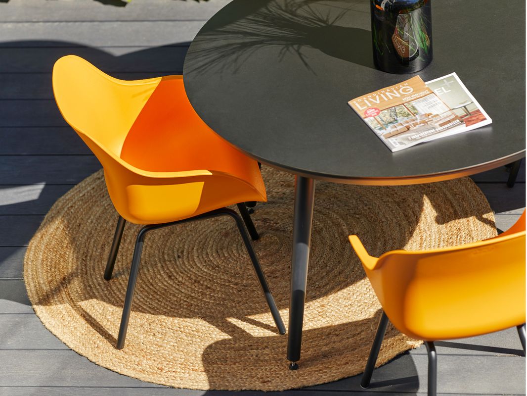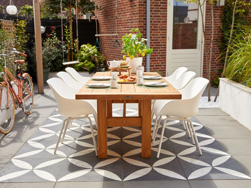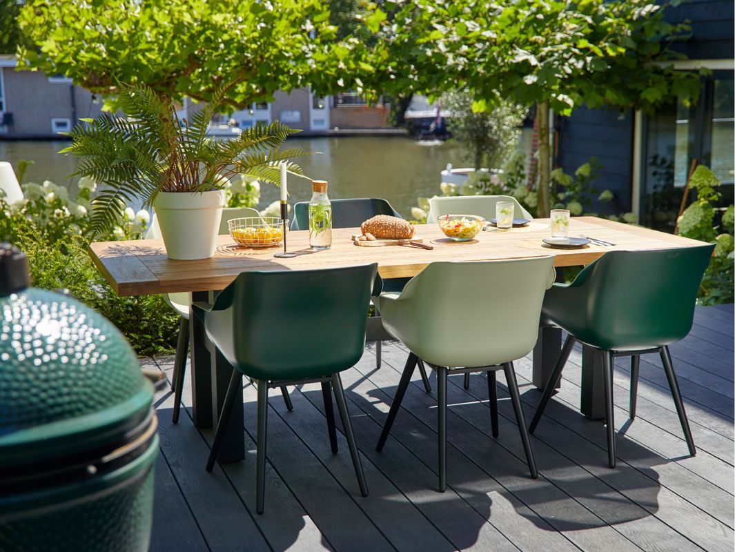 De populaire zwarte staal look is buiten terug te zien in zwarte aluminium onderstellen van stoelen en tafels. Indoor speelt dit thema al enkele jaren, met stalen taats deuren en zwarte kozijnen. Voor outdoor past Harmtan dit ook toe, door deze zwarte staal look (maar dan van aluminium, zodat het in weer en wind mooi blijft) te combineren met warm en levendig teakhout. Een tafel met zwart onderstel en een houten tafelblad is dan ook een krachtig statement en past zonder meer bij de moderne look.