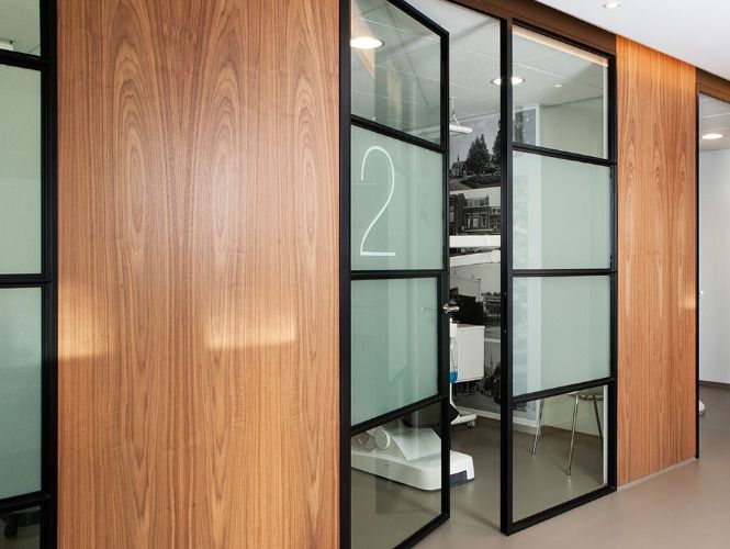Stalen deuren kunnen ook functioneel worden ingezet, zoals in deze tandartsenpraktijk in Haarlem. In dit project plaatste De Rooy zes stalen scharnierdeuren met vijf vaste zijpanelen. Om de privacy van de cliënten te waarborgen, is er gekozen voor matglas.