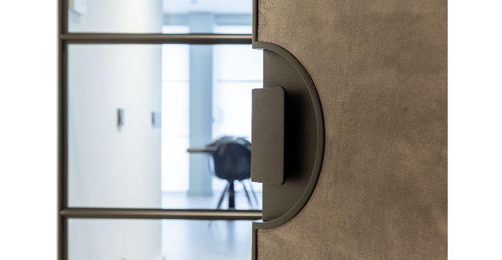 Door te kiezen voor dezelfde vlakverdeling en handgreep, is er rust en eenheid gecreëerd. Het resultaat is een perfecte combinatie van stalen deuren met glas én leer. De deuren zijn voorzien van een prachtige handgreep, ontworpen door Osiris Hertman.