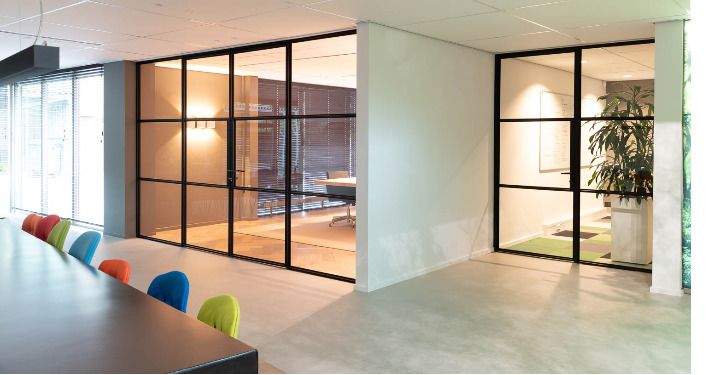 Het resultaat is een inspirerende werkplek met veel licht en een open karakter. Het stoere, zwarte staal met glas is een mooie tegenhanger van het natuurlijke van dit pand. Tegelijkertijd versterkt het elkaar en worden de zichtlijnen van het pand uitstekend benut.
