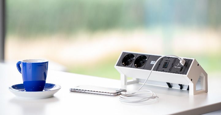 De verplaatsbare DESK 2 verzorgt stijlvol (tijdelijke) oplaadpunten op een aanrechtblad. Dankzij haar modulaire opbouw kan bijna iedere samenstelling - bijvoorbeeld 230V, USB en data aansluitingen - gekozen worden. Deze unit kan zonder gereedschap worden geplaatst en verplaatst. Handig als er even meer aansluitpunten nodig zijn. Natuurlijk kan de unit ook voor langere tijd op een werkblad blijven staan: dankzij haar looks past de DESK2 in bijna ieder interieur.