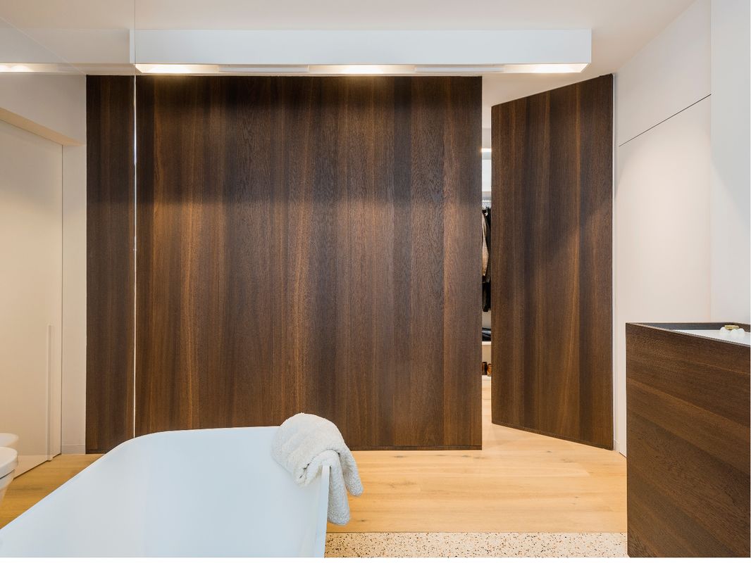 De keuze voor pivoterende binnendeuren is volgens Thomas Nachtergaele vooral een esthetische keuze. Ook hier was dat het geval voor de wand die de dressing van de badkamer scheidt. Uniform afgewerkt met de wand geeft dat dan ook een fraaie aanblik, zelfs met de pivotdeur open. “Toch komt in veel ontwerpen een mix van de verschillende deurbeslagsystemen voor draai-, pivot- en schuifdeuren aan bod,” vertelt hij er volledigheidshalve bij.