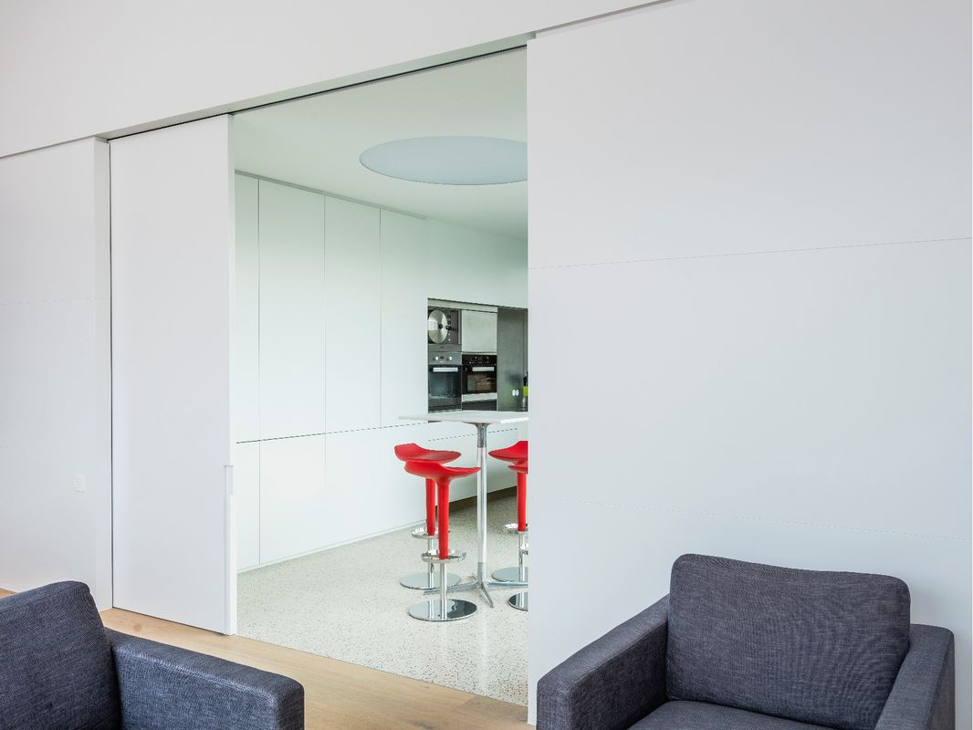 Deze woning is daar geen uitzondering op. Om tussen de keuken en woonkamer het grote muuroppervlak te kunnen vrijhouden voor de verdere inrichting, was het nu eenmaal opportuun om de schuifdeuren in de muren te laten verdwijnen bij het openschuiven. Zelfs met de schuifdeuren open blijft de wand volledig vrij, terwijl je beide ruimtes toch steeds van elkaar kan scheiden.