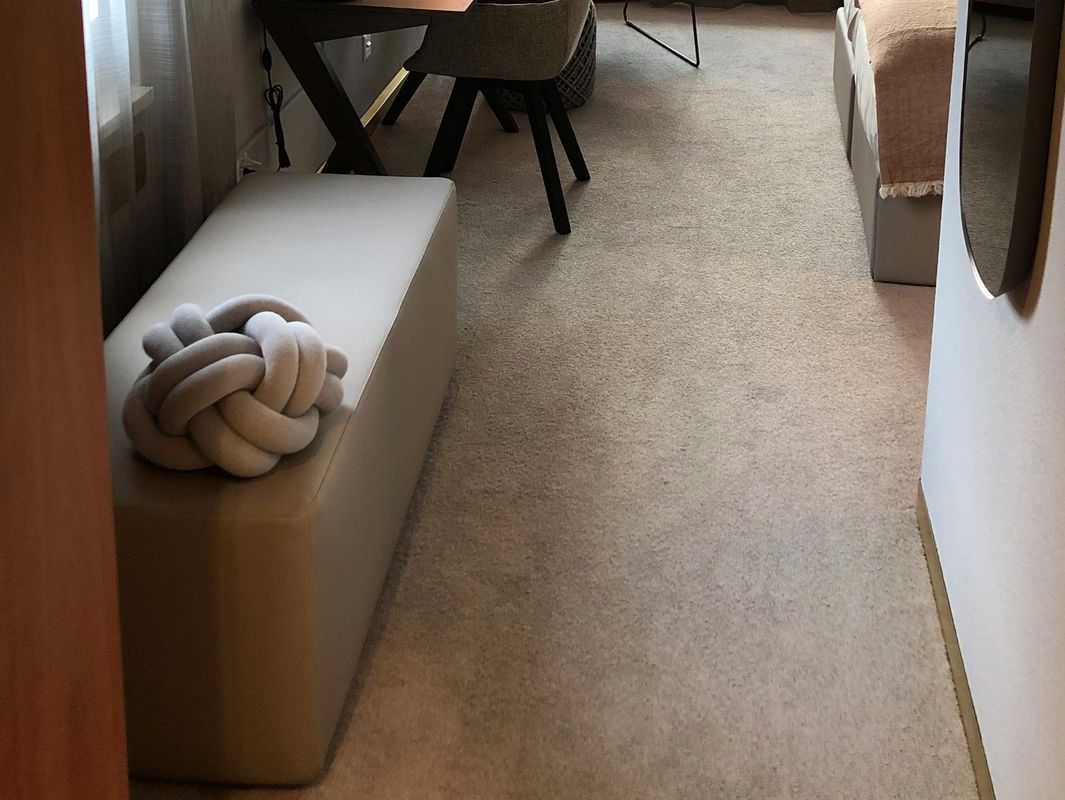 The custom made headboard for the Haiti bed, featuring a vertical striped quilting, was covered in taupe color imitation leather, in harmony with the design and the warm and soft colors of the rooms.