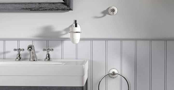 Het toepassen van wit keramiek in het organisch vormgegeven ontwerp van Ivy laat direct zien waar deze serie zich het beste thuisvoelt: in een romantisch klassiek interieur. De inspiratie voor dit elegante ontwerp is afkomstig van het beroemde tafelgerei met ribbels, dat werd ontworpen in de Art Deco periode. In combinatie met het glanzende chroom komen de keramische accenten bijzonder goed tot zijn recht.