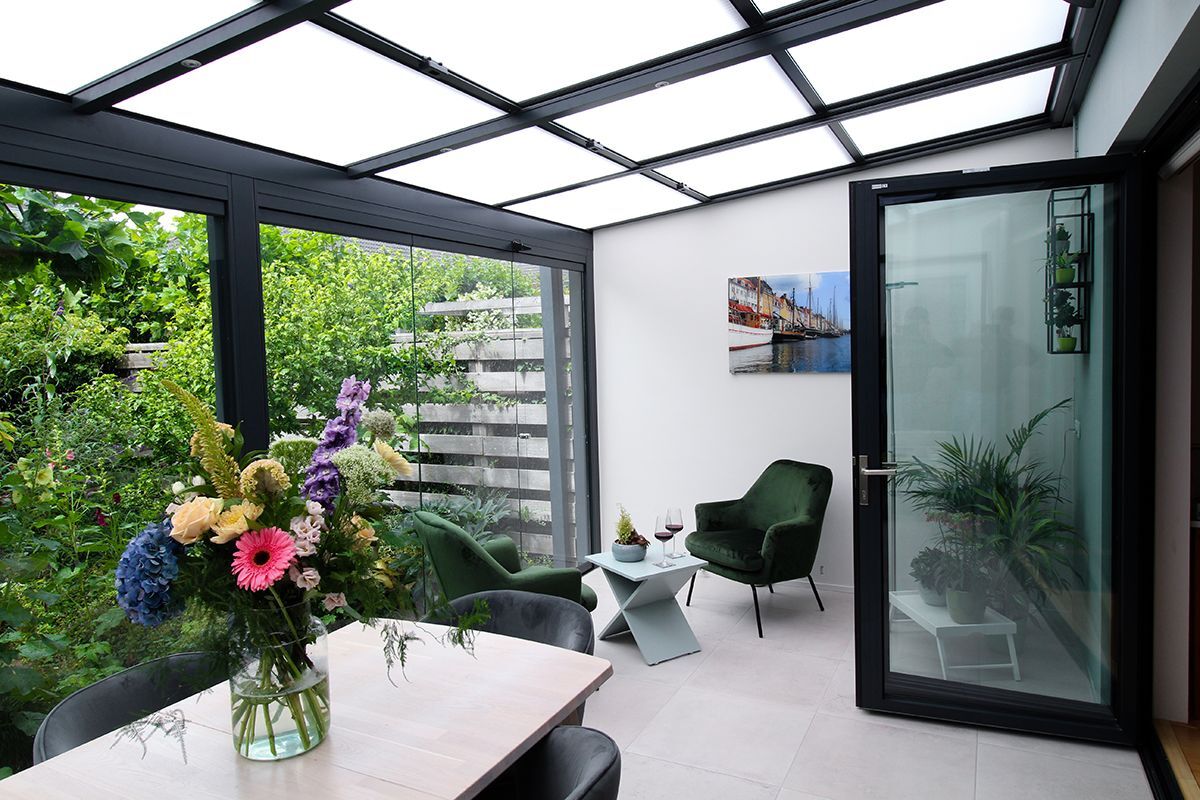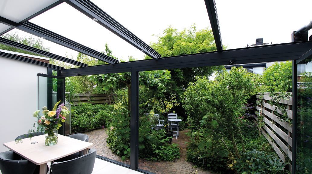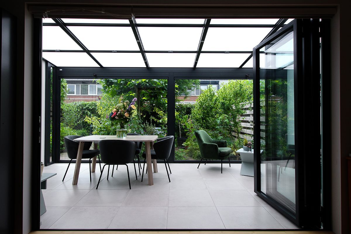 Samen met een specialist zijn er verschillende mogelijkheden bedacht. Belangrijke eis was dat het een lichte ruimte bleef. Een echte aanbouw, zoals de buren, zagen zij niet zitten. Wel konden zij juist deze muren gebruiken om het schuifbare dak tussen te plaatsen. Het uitzicht naar de tuin mocht zo transparant mogelijk.