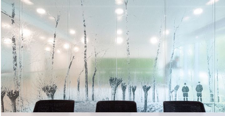 Glazen wanden komen, met name in kantoren, veel voor. Logisch want het is een uitstekende manier om ruimtes te scheiden zonder te verliezen aan transparantie en licht. Door deze glazen wanden te voorzien van creatieve patronen en visuals, kunt u juist in samenspel met licht, verbluffend mooie resultaten behalen. Wat dacht u van een stippenpatroon dat van dichtbij privacy biedt, maar op een grote afstand een betekenisvolle foto blijkt te zijn?