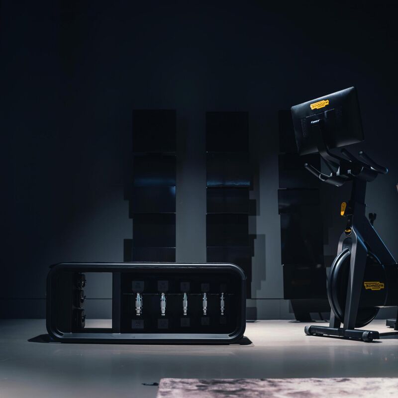 De robuuste en stijlvolle alles-in-een fitnessbank voor een complete workout. Past in elke ruimte. Inclusief dumbbells, mat, weerstandselastieken en weight knuckles. Rechts een glimp van de Technogym Bike. Met de beste live en on demand indoor cyclinglessen en total body workouts